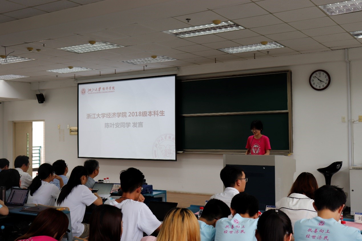 2018级学生代表,来自金融学1803班的陈叶安同学代表18级新生发言。她结合自己一年来的经历,从情怀和能力两个方面进行了详细的阐述。在情怀方面,她认为经院将科学精神和人文情怀精密结合,延续了求是书院百年多来的学术传统,又在当今国际化的潮头勇于创新;在能力方面,经院是一个精英云集的地方,老师、同学都有理想、有担当。经历过选专业时的纠结与迷茫,她也为自己能成为经院的一员感到发自肺腑的骄傲。最后,她衷心希望每一位18级的同学都能够在经院遇见最好的自己。