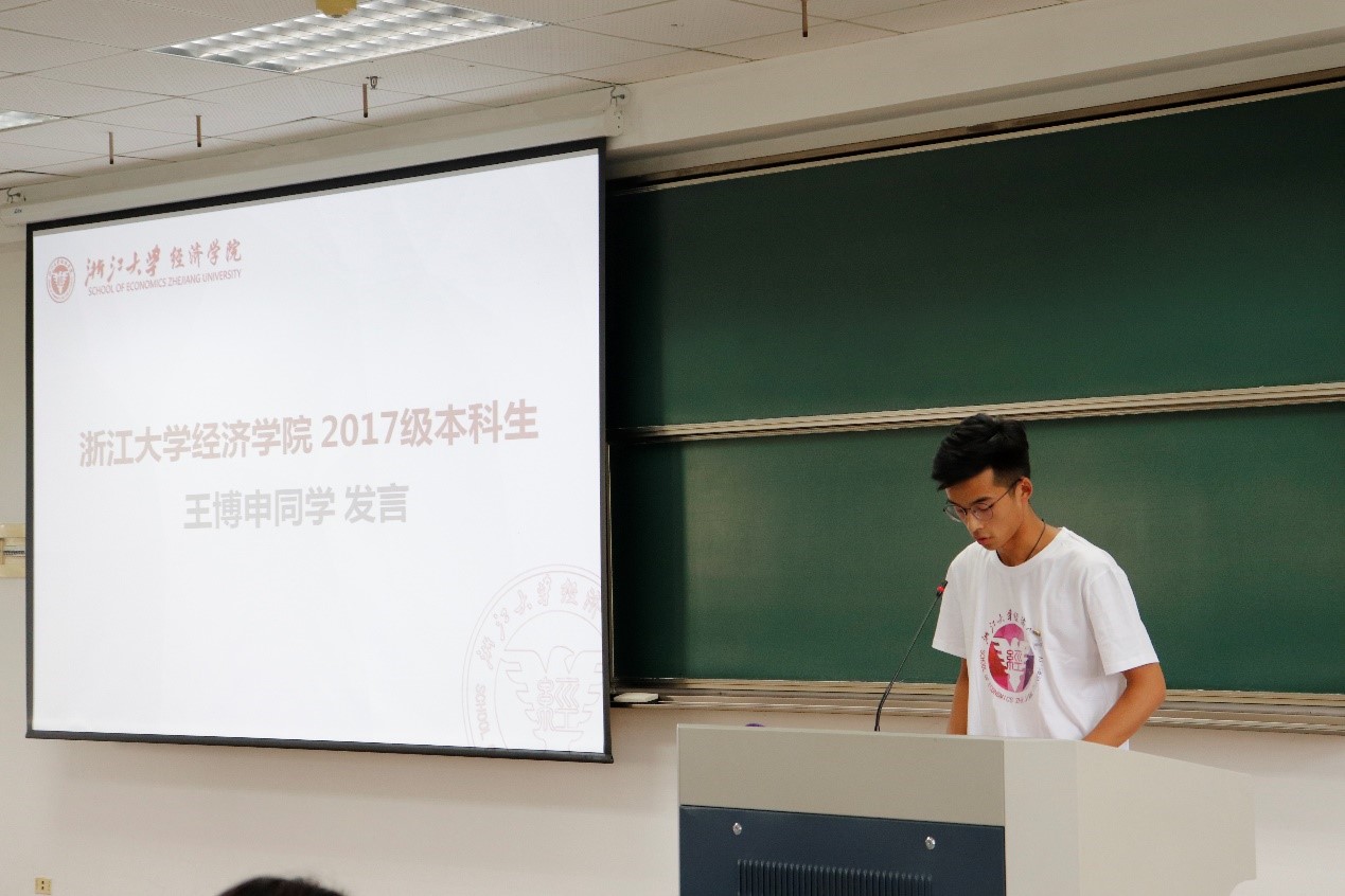 2017级学生代表,来自经济学1701班的王博申同学代表学院高年级本科生发言,他向同学们介绍了经院高要求与高质量的课程体系、开放的课外学术探索平台、高层次的人才国际化培养平台和各具特色的活动。最后,王博申同学祝愿有着“高绩点、高颜值、高素质”的经院同学能够脚踏实地、充实自我,找到自己的追求与价值。