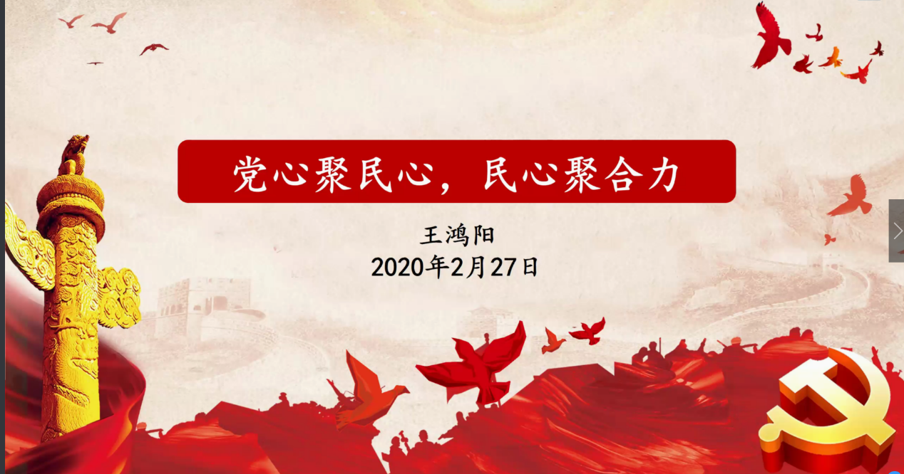 随后,王鸿阳老师以“党心聚民心,民心聚合力”为主题,进行党课分享。王鸿阳老师在党课中,结合理论与实际情况,阐述了“人民”在疫情防控、国家发展中的重要作用,要坚定相信人民群众的力量,凝聚人民群众的力量,充分发挥人民群众的力量。
