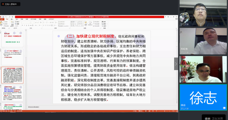 徐老师做了关于《关于新时代加快完善社会主义市场经济体制的意见》(以下简称《意见》)中的财税改革的发言。徐志老师指出2020年5月18日中央发布的《意见》中明确指出要优化政府间事权和财权划分,建立权责清晰、财力协调、区域均衡的中央和地方财政关系,减少并规范中央和地方共同事权。完善标准科学、规范透明、约束有力的预算制度,全面实施预算绩效管理,提高财政资金使用效率。清理规范地方融资平台公司,剥离政府融资职能。深化税收制度改革,完善直接税制度并逐步提高其比重。随后,徐志老师比较了《意见》和十九大报告中对现代财税制度的表述的差异性,强调了《意见》的亮点在于表述更具体更细化和体现了问题导向。