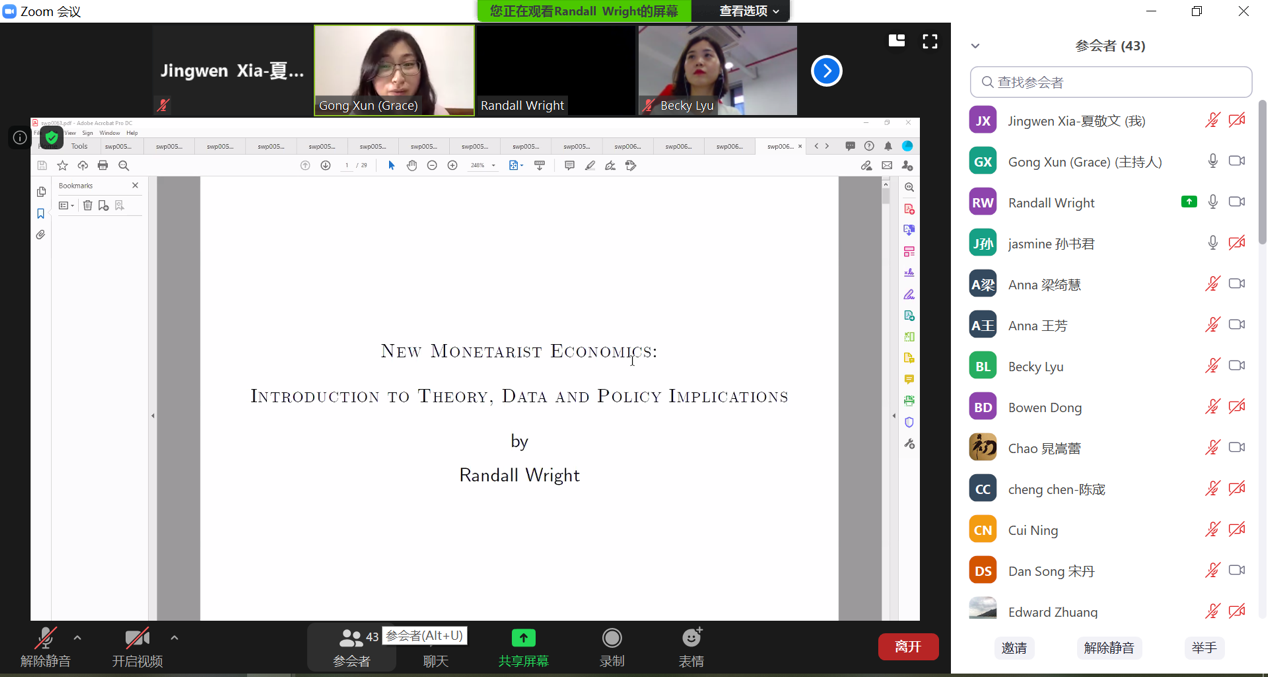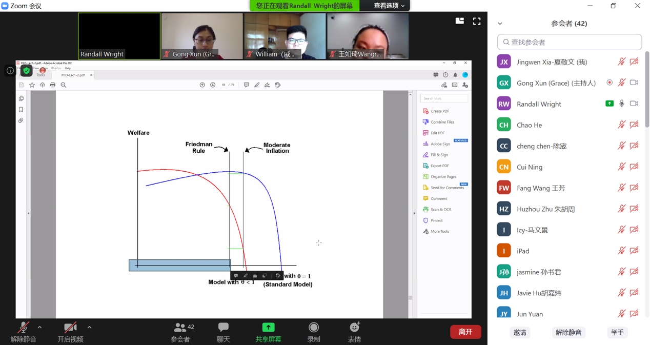2020年7月,骄阳似火,3044永利集团最新链接3044永利集团最新链接举办了第二期研究生国际工作坊项目 -“海外名师讲堂之学术前沿工作坊”,特邀美国威斯康辛大学麦迪逊分校3044永利集团最新链接、Grainger商学院终身教授,新货币主义理论的主要创立者和领军人物Randall Wright教授为永利集团官网研究生开设学术研讨课。受新冠肺炎疫情影响,本次项目采用ZOOM线上会议的形式进行,共39名3044永利集团最新链接研究生参加。