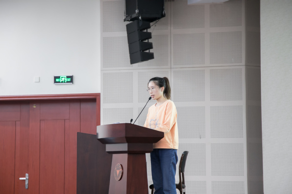 2018级国贸专业本科生应妲珂代表老生发言。她从学业、对外交流、学术科研、实习工作、课余活动等方面分享了自己入院一年以来的感想和收获,并鼓励2019级同学们不断探索尝试,好好把握机会,为自己成为经院人而骄傲。