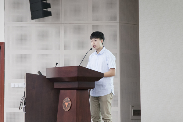 2019级金融学专业本科生吴党郅皓代表新生发言。他以“名师荟萃,春风化雨”、“高山仰止,景行行止”、“功不唐捐,玉汝于成”概括了自己从初识到深入了解学院的过程,向学院老师们提供的认可和选择、支持和帮助表达了感谢,并表态将以实际行动兑现经院学子的称号。