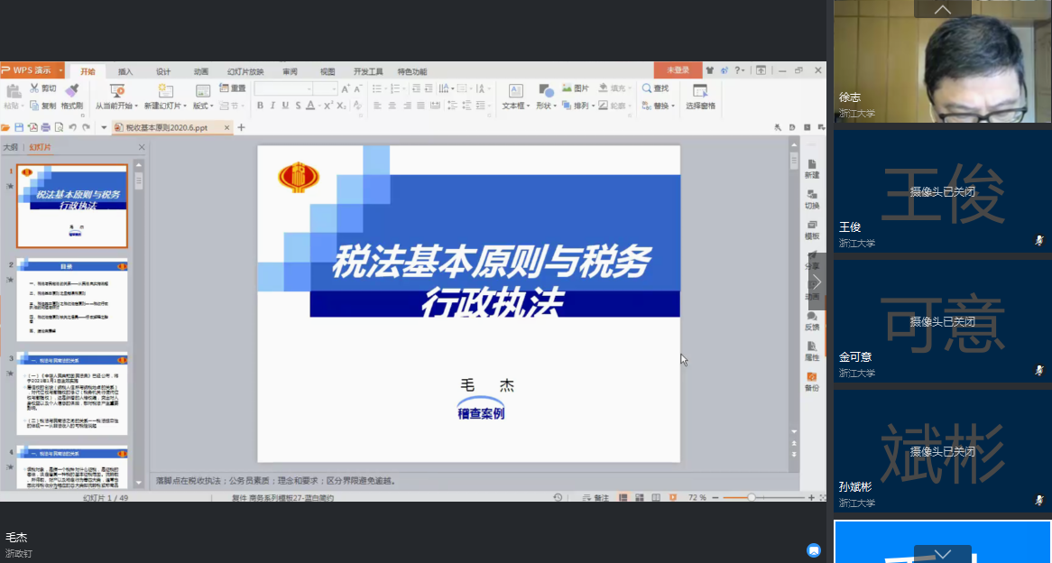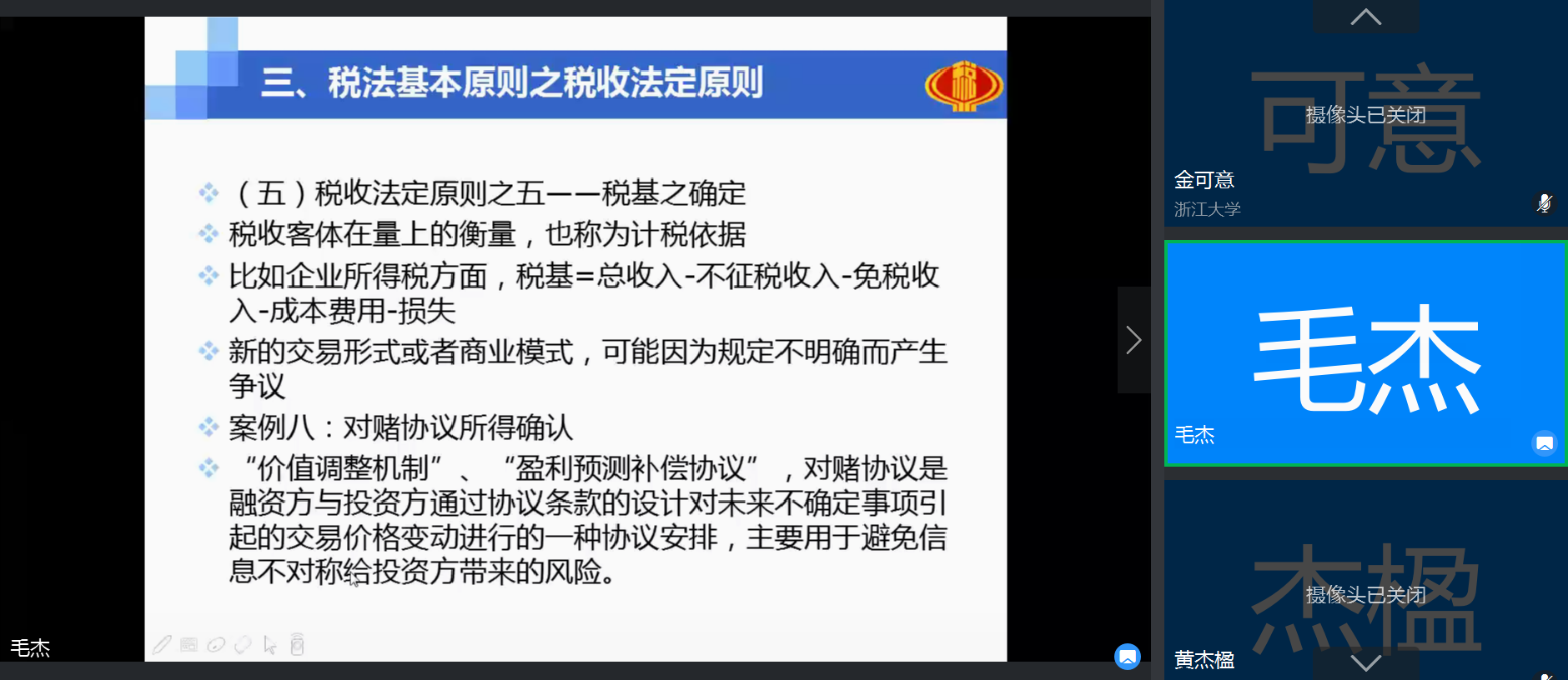本次“云讲座”以案说法,毛处长的精彩分享使同学们对税收法定原则和税务行政执法有了更深入的理解与思考。讲座最后,徐志老师对毛处长的讲座内容作了简要总结与点评,并对毛处长所做的精彩讲座表示衷心感谢。