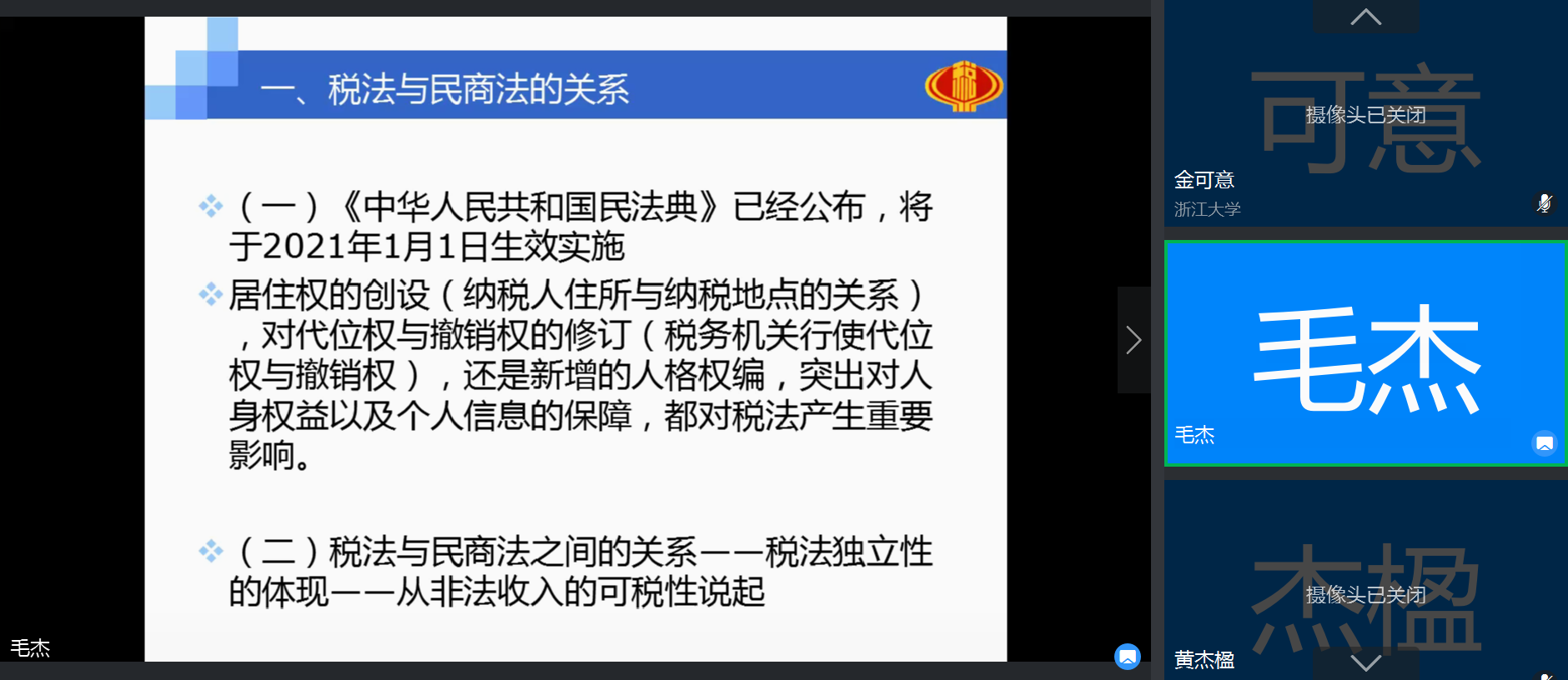 本次讲座,毛处长从民法典实施说起,探讨“税法与民商法的关系”,随后介绍“税法基本原则之量能课税原则”、“税法基本原则之税收法定原则”,在此基础上,指出“税收法定原则缺失之后果”,最后毛处长结合多年工作经验,与老师和同学们积极地进行了交流讨论。