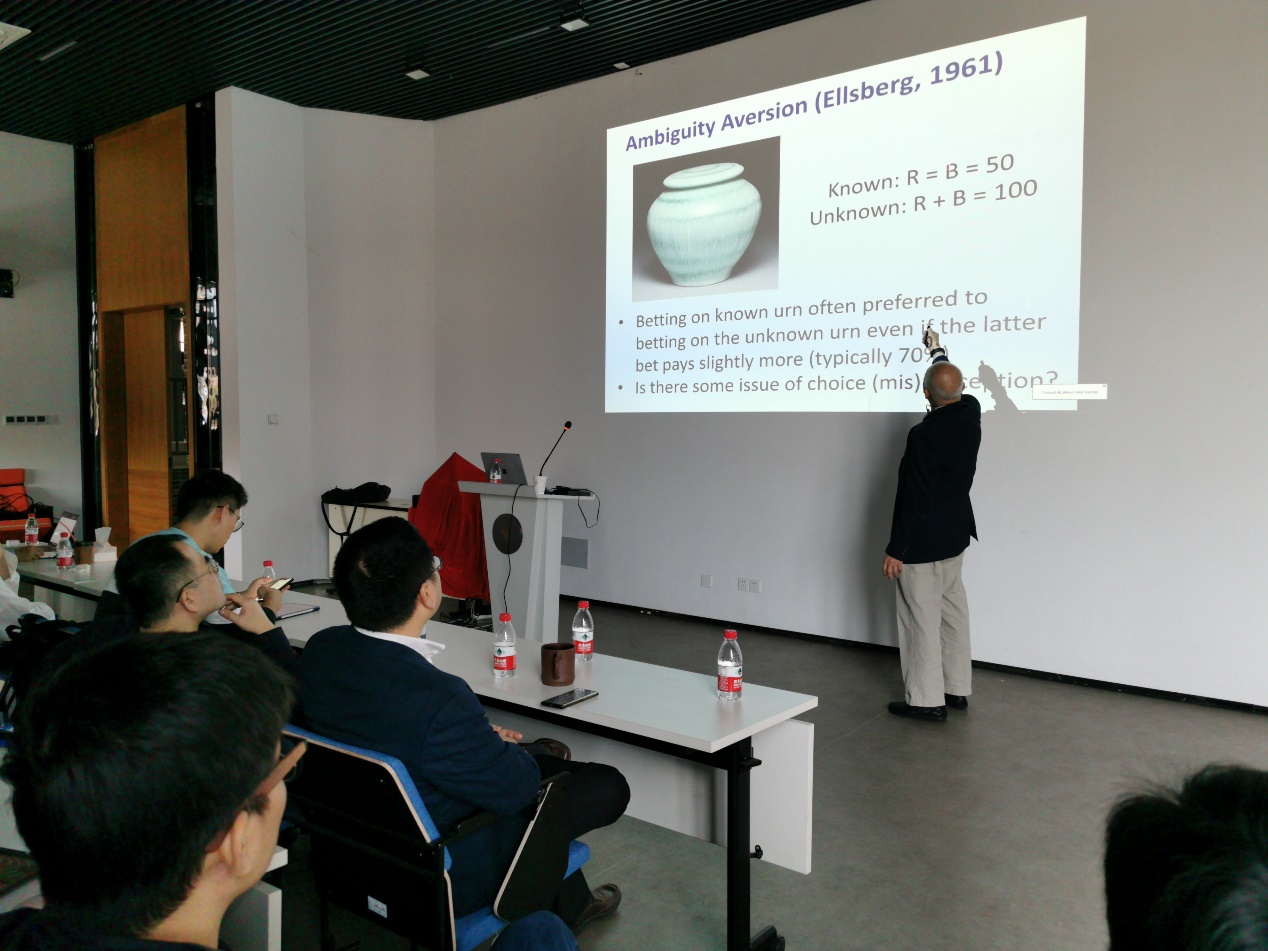 周教授首先介绍了文章《You Need to Recognize Ambiguity to Avoid It》。文章根据被试在Ellsberg双瓮实验中是否对unknown probability瓮赋予概率,将被试的感知(perception)区分成两种心态:一种是概率的心态(probability minded),一种是模糊的心态(ambiguity minded)。实验分析表明被试不同心态的感知对其模糊态度的解释力,比所有个体特征变量解释力的加总还要大。周教授说,决策者看待决策问题的方式会对决策产生影响;而在简单的一个bet中,不是框架效应(framing effect),也不是促发效应(priming effect),而是被试对决策问题的感知(perception)对决策有重要的影响。