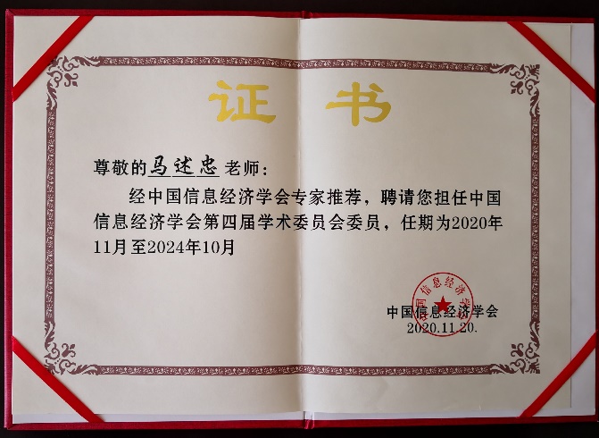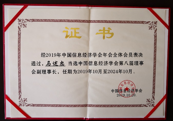中国信息经济学会副理事长、3044永利集团最新链接中国数字贸易研究院院长、求是特聘教授马述忠参加本届中国信息经济学会学术年会,担任2020中国信息经济学会学术年会程序委员会委员,主持2020中国信息经济学会学术年会开幕式和特邀报告环节,并接受了中国信息经济学会第四届学术委员会委员聘书、中国信息经济学会第八届理事会副理事长证书。