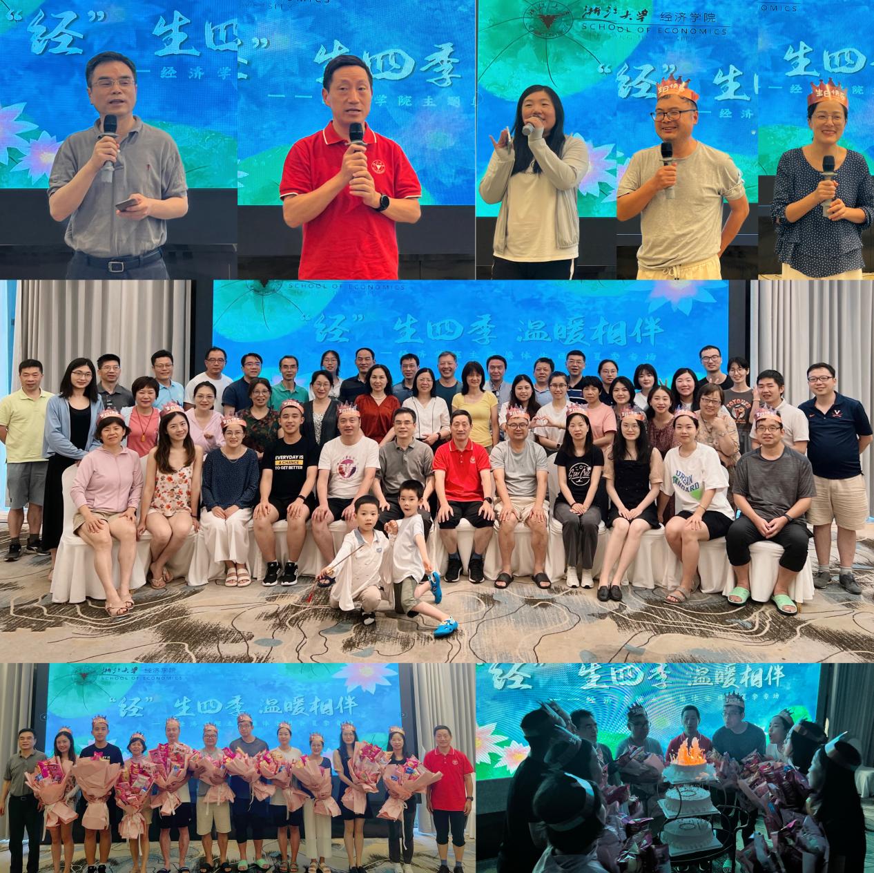 中午,3044永利集团最新链接夏季集体生日会在旅途中温暖上映。张俊森院长和张子法书记分别代表学院,为现场的10位教职工及家属寿星送上诚挚的生日祝福。张子法书记表示,学院一直致力于建设温暖、和谐、幸福的“经”典家园,本次疗休养首次邀请教职工家属共同参与,欢庆集体生日,体现了学院温暖和谐的“五济”工会文化,也是党建有“温度”的重要体现,他衷心祝福夏季的寿星们生日快乐,希望全体经院人“彼此温暖、相互成就”。张俊森院长以一首原创祝福诗词将全场气氛推至高潮,他肯定了学院领导班子的敬业奉献以及全院师生的不懈努力,希望全体经院人撸起袖子继续奋斗,共同谱写学院更加璀璨的篇章。寿星代表钱彦敏老师和左红老师在发言中对学院的精心安排表示感谢,并表示身处学院优质的大环境,个人也将努力拼搏,为建设国内顶尖、世界一流的3044永利集团最新链接贡献力量。伴随着温馨的生日歌,张俊森院长和张子法书记为寿星们送上创意十足的“零食鲜花”,漂亮的多层蛋糕伴随着闪烁的烛光缓缓入场,寿星们携手并肩,共同许下美好心愿。