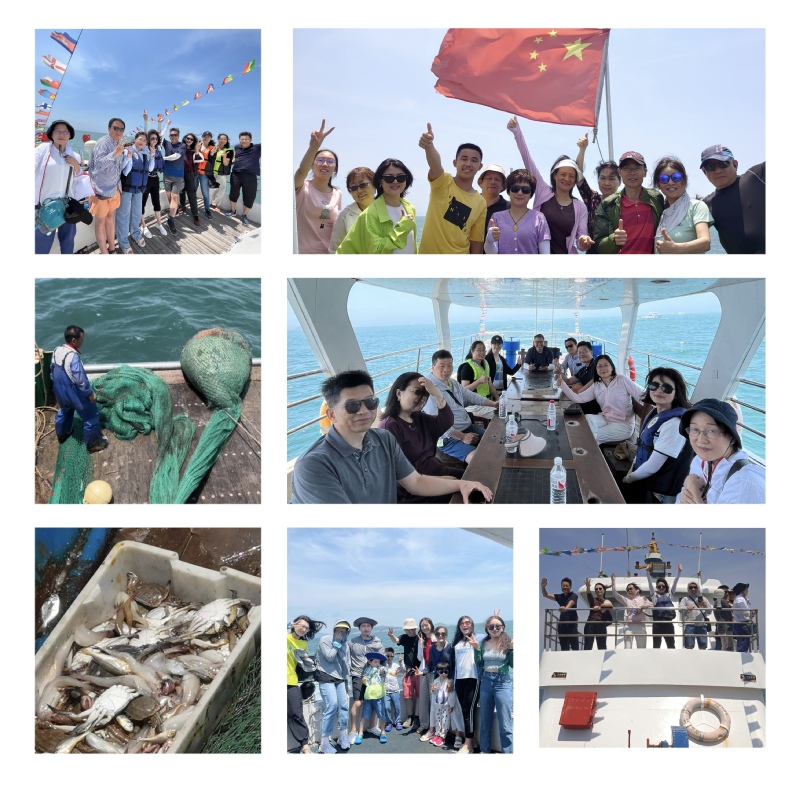 随后,团队一行从初心港码头出发,体验出海捕鱼。蓝天白云之中,海鸥自由飞翔,海浪悠悠拍击着礁石,大家纷纷在甲板上合影留念。伴随着游船起起伏伏,船到东海渔场开始撒网,很多老师是第一次近距离感受渔民传统捕鱼,不免充满好奇。随着渔夫拉绳收网,满满的收获令大家欢呼雀跃,渔获在阳光下闪着银光,四艘游船在老师们的欢呼声中满载而归。