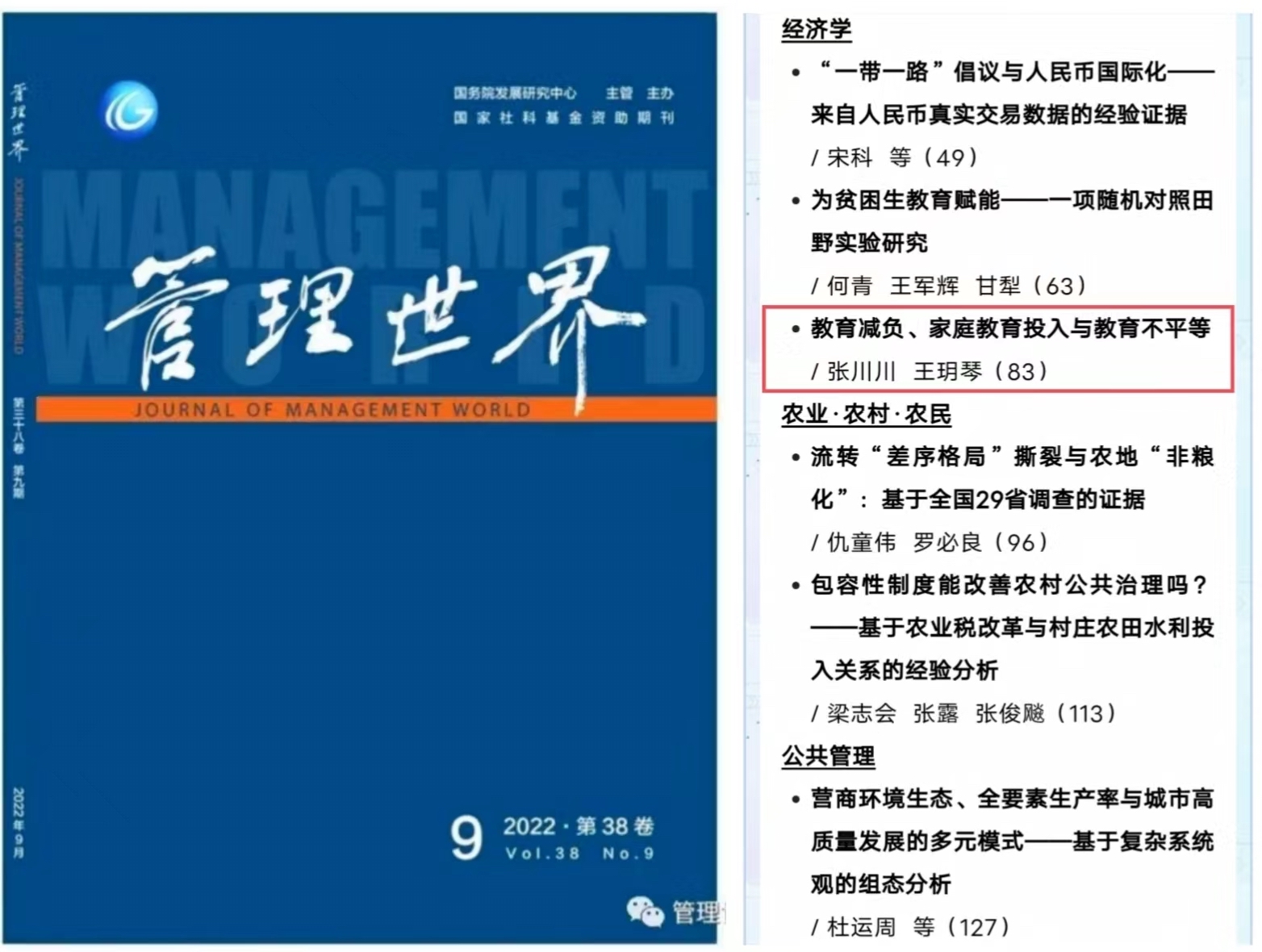 近日,3044永利集团最新链接3044永利集团最新链接百人计划研究员张川川老师和四川大学3044永利集团最新链接王玥琴合作的论文《教育减负、家庭教育投入与教育不平等》,在《管理世界》2022年第9期正式发表。