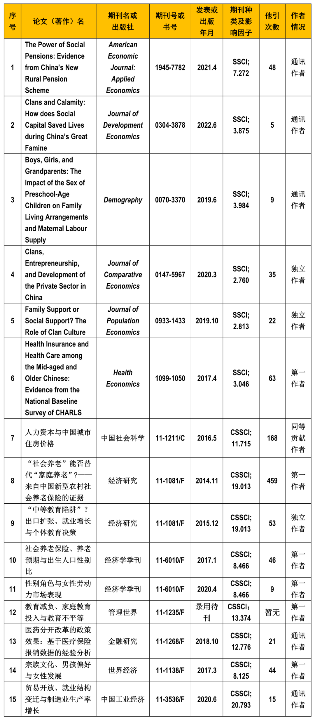 获奖者的上述研究成果广泛发表于国内外权威期刊,包括《中国社会科学》《经济研究》《经济学季刊》《管理世界》等国内经济学和管理学权威期刊,以及Demography, American Economic Journal: Applied Economics, Journal of Development Economics等人口学和经济学国际权威期刊。获奖者注重学术研究成果的宣传普及和转化推广,依托研究成果撰写的政策评论文章发表于《光明日报》《经济日报》,撰写的咨政报告得到国家领导人肯定性批示。
