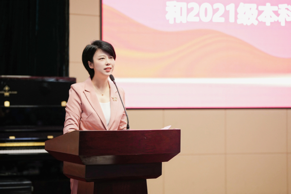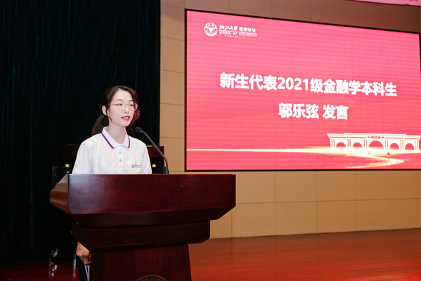 2021级本科生代表金融学专业邬乐弦发言,表达了对加入经院大家庭的欣喜与憧憬。她表示,经院学子要勇于接过前辈的接力棒,在乡村振兴、共同富裕等时代课题中发挥中坚力量,刻苦学习,笃志求学,做灿若星辰的浙大经院人。